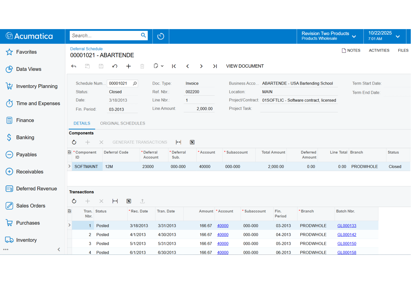 With Acumatica, financial leaders can automate deferred revenue calculations by assigning a schedule to any affected transaction line item or inventory component. Accurately implement and account for deferred revenues and deferred expenses by integrating with other financial modules. Use templates for payables for expense amortisation. Attach schedules to inventory items so Sales Orders and Purchase Orders are processed according to the proper accounting rules.
