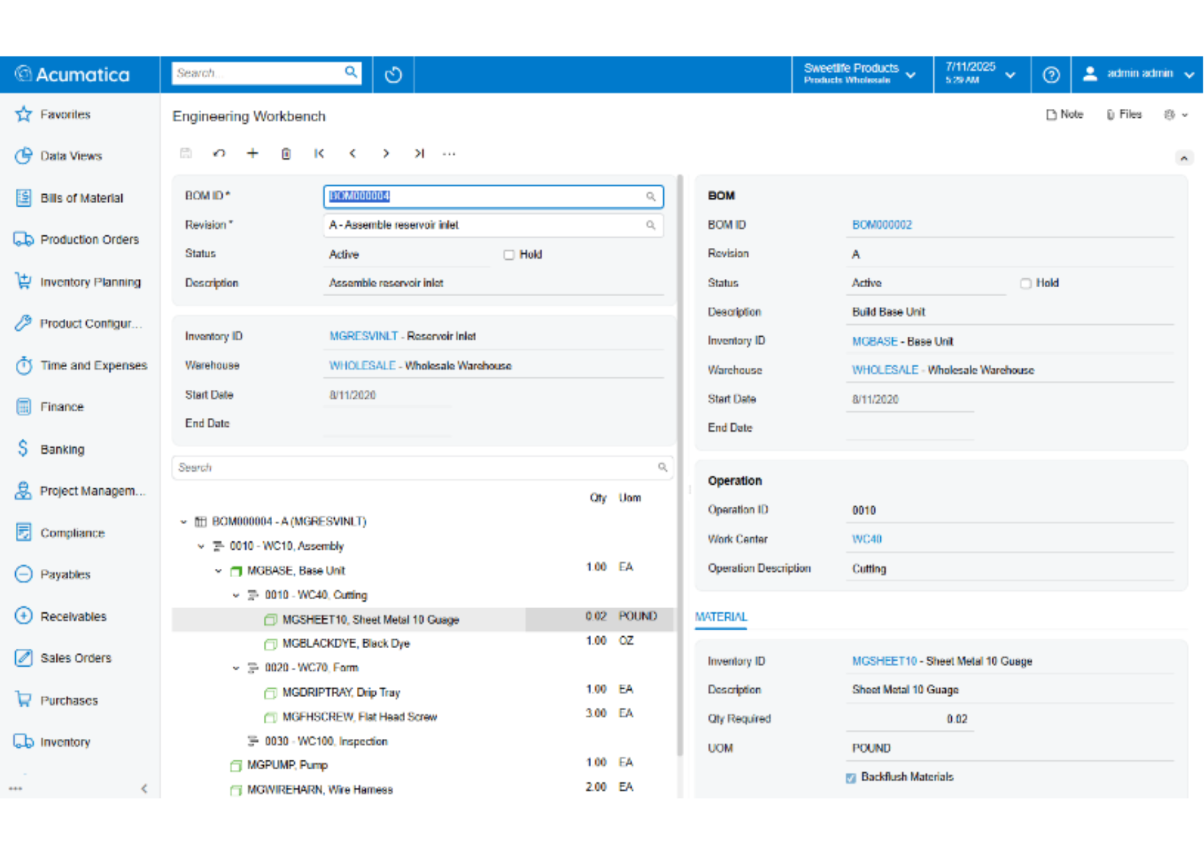 Acumatica uses an integrated bill of material and routing where defined steps in the production process include both material and labour operations. This structure is common in most modern ERP applications.