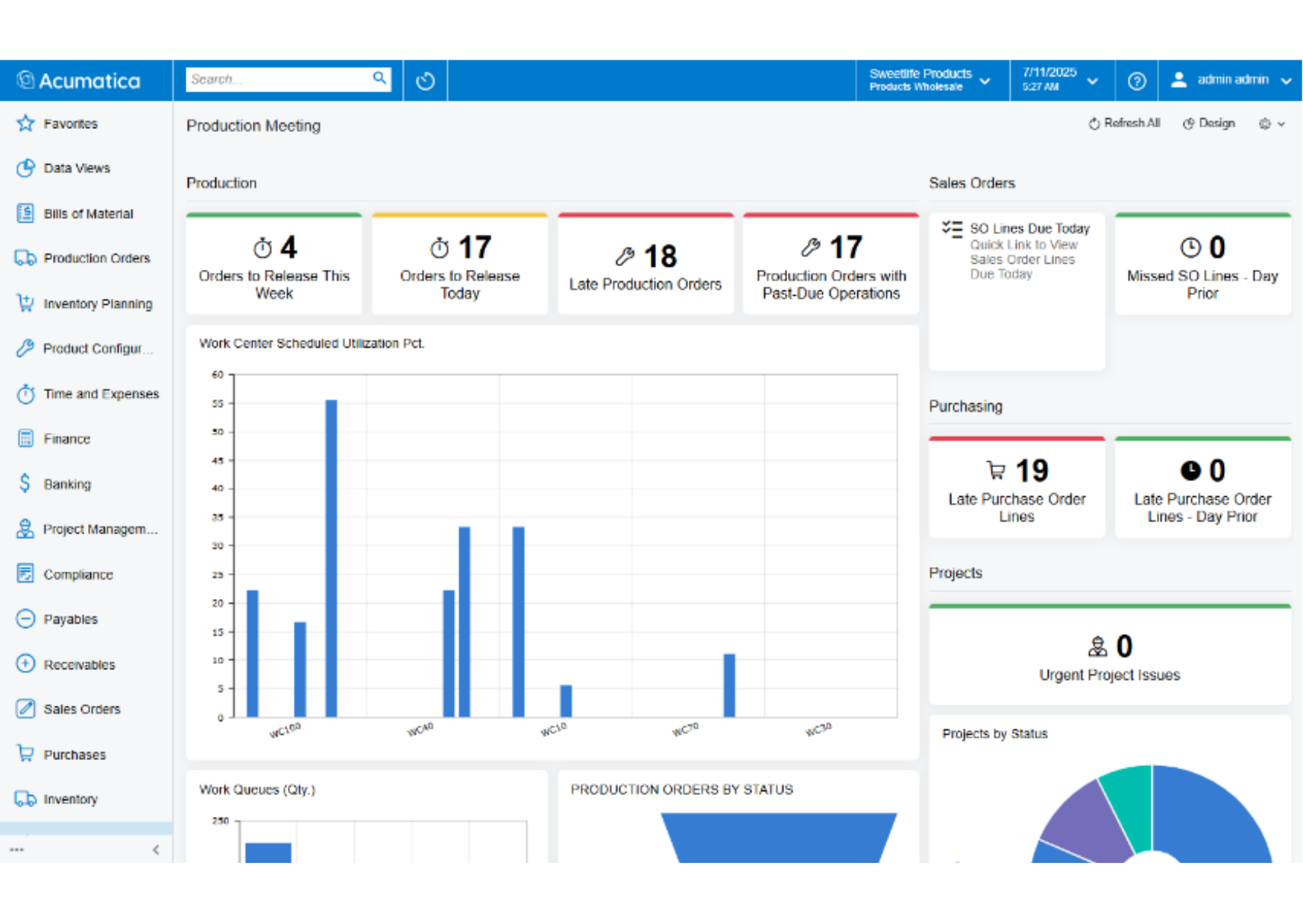 Monitor production in real-time with the production manager and production meeting dashboards for insights into work centre utilization, work queues, order status, past due operations, late orders, and work in process (WIP).
